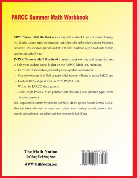 Prepare for the PARCC Math test with a perfect workbook! PARCC Summer Math Workbook is a learning math workbook to prevent Summer learning loss. It helps students retain and strengthen their Math skills and provides a strong foundation for success. This workbook provides students with solid foundation to get a head starts on their upcoming school year. PARCC Summer Math Workbook is designed by top test prep experts to help students prepare for the PARCC Math test. It provides test-takers with an in-depth focus on the math section of the test, helping them master the essential math skills that test-takers find the most troublesome. This is a prestigious resource for those who need an extra practice to succeed on the PARCC Math test in the summer. PARCC Summer Math Workbook contains many exciting and unique features to help your student scores higher on the PARCC Math test, including: * Over 2,500 of standards-aligned math practice questions with answers * Complete coverage of all Math concepts which students will need to ace the PARCC test * Content 100% aligned with the latest PARCC test * Written by PARCC Math experts * 2 full-length PARCC Math practice tests (featuring new question types) with detailed answers This Comprehensive Summer Workbook for the PARCC Math is a perfect resource for those PARCC Math test takers who want to review core content areas, brush-up in math, discover their strengths and weaknesses, and achieve their best scores on the PARCC test. Published By: The Math Notion www.mathnotion.com