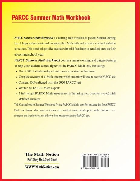 Prepare for the PARCC Math test with a perfect workbook! PARCC Summer Math Workbook is a learning math workbook to prevent Summer learning loss. It helps students retain and strengthen their Math skills and provides a strong foundation for success. This workbook provides students with solid foundation to get a head starts on their upcoming school year. PARCC Summer Math Workbook is designed by top test prep experts to help students prepare for the PARCC Math test. It provides test-takers with an in-depth focus on the math section of the test, helping them master the essential math skills that test-takers find the most troublesome. This is a prestigious resource for those who need an extra practice to succeed on the PARCC Math test in the summer. PARCC Summer Math Workbook contains many exciting and unique features to help your student scores higher on the PARCC Math test, including: * Over 2,500 of standards-aligned math practice questions with answers * Complete coverage of all Math concepts which students will need to ace the PARCC test * Content 100% aligned with the latest PARCC test * Written by PARCC Math experts * 2 full-length PARCC Math practice tests (featuring new question types) with detailed answers This Comprehensive Summer Workbook for the PARCC Math is a perfect resource for those PARCC Math test takers who want to review core content areas, brush-up in math, discover their strengths and weaknesses, and achieve their best scores on the PARCC test. Published By: The Math Notion www.mathnotion.com
