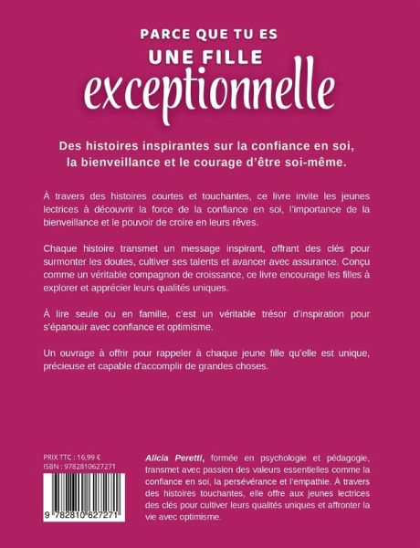Alicia Peretti est une auteure reconnue pour son approche bienveillante et inspirante de la littérature jeunesse, spécialisée dans le développement personnel des enfants et des adolescents. Formée en psychologie et en pédagogie, elle a consacré sa carrière à transmettre des valeurs essentielles telles que la confiance en soi, la résilience et la bienveillance à travers des histoires captivantes et porteuses de sens. En créant des récits accessibles et émouvants, Alicia cherche à offrir aux jeunes lectrices des clés pour comprendre et cultiver leurs qualités uniques, tout en les aidant à surmonter les doutes et à avancer avec assurance. Convaincue de l' impact positif de la littérature sur le développement émotionnel des enfants, elle écrit des histoires qui résonnent aussi bien chez les jeunes filles que chez leurs parents, en rendant les notions d'estime de soi et d'accomplissement personnel inspirantes et concrètes. Ses livres, remplis de messages positifs et de conseils pratiques, sont de véritables guides pour aider chaque fille à grandir avec confiance, fierté et bienveillance.