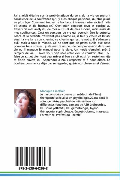 J'ai choisit d'écrire sur la problématique du sens de la vie en prenant conscience de la souffrance qu'il y a en chaque personne, du plus jeune au plus âgé. Comment trouver le bonheur à travers notre société faite d'illusions et de frustration? C'est mon parcours revu et corrigé au travers de mes analyses, de mes outils et de mes espoirs, mais aussi de mes souffrances. C'est un parcours de vie qui pourrait être le votre.La Grace et la sérénité n'arrivent pas comme ca, il faut y croire et laisser aussi la vie faire son chemin, ce chemin qui est le notre. Il s'adresse a qui? mais à tout le monde. Ce ne sont que de petits outils que nous pouvons tous utiliser . juste mettre un peu de compréhension dans une vie ou il manque le manuel pour la vivre. Un mode d'emploi, prêt à l'emploi de vie..... Avez vous déjà rêvé votre vie? Je voudrais être.....ou faire cela.....et bien tout peu arriver si l'on y croit et si l'on reste honnête et fidèle envers soi. Apprenons a nous respecter et à nous aimer. Le bonheur commence déjà par se regarder, guérir nos blessures et s'aimer.
