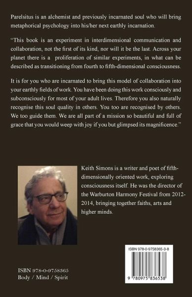 Parelsitus is an alchemist and previously incarnated soul who will bring metaphorical psychology into his/her next earthly incarnation. "This book is an experiment in interdimensional communication and collaboration, not the first of its kind, nor will it be the last. Across your planet there is a proliferation of similar experiments, in what can be described as transitioning from fourth to fifth-dimensional consciousness. It is for you who are incarnated to bring this model of collaboration into your earthly fields of work. You have been doing this work consciously and subconsciously for most of your adult lives. Therefore you also naturally recognise this soul quality in others. You too are recognised by others. We too guide them. We are all part of a mission so beautiful and full of grace that you would weep with joy if you but glimpsed its magnificence.