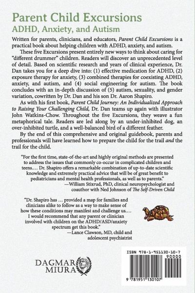 Written for parents, clinicians, and educators, Parent Child Excursions is a practical book about helping children with ADHD, anxiety, and autism. In this unique approach, Dr. Dan presents ADHD as a problem with stopping, anxiety as a problem with going, and autism as difficulty balancing these competing tendencies. From the introduction: "This book is quite simply a story of red light and green light, braking and accelerating, holding back and forging ahead." Based on this simple formulation, management of problems with self-control depends on finding the right balance between excitation and inhibition. These five Excursions present entirely new ways to think about caring for "different drummer" children. Readers will discover an unprecedented level of detail. Based on scientific research and years of clinical experience, Dr. Dan takes you for a deep dive into: (1) effective medication for ADHD, (2) exposure therapy for anxiety, (3) combined therapies for coexisting ADHD, anxiety, and autism, and (4) social engineering for autism. The book concludes with an in-depth discussion of (5) autism, sexuality, and gender variation, cowritten by Dr. Dan and his son Dr. Aaron Shapiro. As with his first book, Parent Child Journey: An Individualized Approach to Raising Your Challenging Child, Dr. Dan teams up again with illustrator John Watkins-Chow. Throughout the five Excursions, they weave a fun metaphorical tale. Readers are led along by an under-inhibited dog, an over-inhibited turtle, and a well-balanced bird of a different feather. By the end of this comprehensive and original guidebook, parents and professionals will have learned how to prepare the child for the trail and the trail for the child.