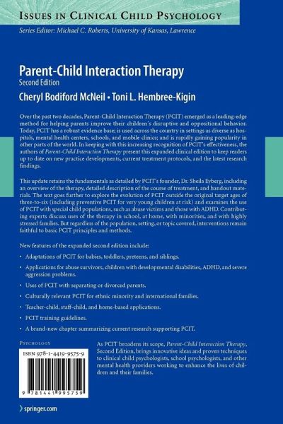 Adaptations of PCIT for babies, toddlers, preteens, and siblings.Applications for abuse survivors, children with developmental disabilities, ADHD, and severe aggression problems. Uses of PCIT with separating or divorced parents.Culturally relevant PCIT for ethnic minority and international families.Teacher-child, staff-child, and home-based applications.PCIT training guidelines.A brand-new chapter summarizing current research supporting PCIT.As PCIT broadens its scope, Parent-Child Interaction Therapy, Second Edition, brings innovative ideas and proven techniques to clinical child psychologists, school psychologists, and other mental health providers working to enhance the lives of children and their families.