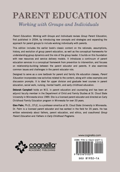 Parent Education: Working with Groups and Individuals revises Group Parent Education, first published in 2004, by introducing new concepts and strategies and expanding the approach for parent groups to include working individually with parents. This edition includes the earlier book's classic content on the rationale, assumptions, history, and evolution of group parent education, as well as the conceptual frameworks for understanding group dynamics and the role of the group leader. It builds on this foundation with new resources and service delivery models. It introduces a continuum of parent education services in a conceptual framework from prevention to intervention, and focuses on relationship-building between the parent educator and parents. It also examines common issues and challenges in the parent educator role. Designed to serve as a core textbook for parent and family life education classes, Parent Education incorporates new activities related to the content, along with video examples and discussion prompts. It is ideal for upper division and graduate level courses in parent education, social work, nursing, mental health, and early childhood education. Glen Palm, Ph.D., CFLE, is a professor emeritus at St. Cloud State University in Minnesota. Dr. Palm is a licensed parent educator and has worked in the field for 35 years. He has written extensively about fathers, parent education, and ethics, and coauthored Group Parent Education and Fathers in Early Childhood Programs. Deborah Campbell holds an M.S. in parent education and counseling and has been an adjunct faculty member in the Department of Child and Family Studies at St. Cloud State University in Minnesota since 1989. She is a licensed parent educator and directed an Early Childhood Family Education program in Minnesota for over 20 years.