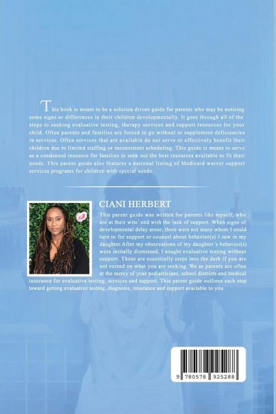 This book is meant to be a solutions driven guide for parents who may be noticing some signs or differences in their children developmentally. It goes through all of the steps to seeking evaluative testing, therapy services and support resources for your child. Often parents and families are forced to go without or supplement deficiencies in services. Often services that are available do not serve or effectively benefit their children due to limited staffing or inconsistent scheduling. This guide is meant to serve as a condensed resource for families to seek out the best resources available to fit their needs. This parent guide also features a national listing of medicaid waiver support services programs for children with special needs.