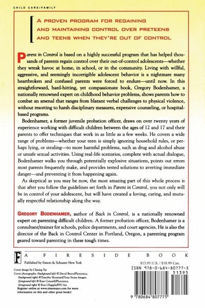 Parent in Control is based on a highly successful program that has helped thousands of parents regain control over their out-of-control adolescents - whether they wreak havoc at home, in school, or in the community. Living with willful, aggressive, and seemingly incorrigible adolescent behavior is a nightmare many heartbroken and confused parents were forced to endure - until now. In this straightforward, hard-hitting, yet compassionate book, Gregory Bodenhamer, a nationally renowned expert on childhood behavior problems, shows parents how to combat an arsenal that ranges from blatant verbal challenges to physical violence, without resorting to harsh disciplinary measures, expensive counseling, or hospital-based programs. Bodenhamer, a former juvenile probation officer, draws on over twenty years of experience working with difficult children between the ages of 12 and 17 and their parents to offer techniques that work in as little as a few weeks. He covers a wide range of problems - whether your teen is simply ignoring household rules, or perhaps lying, or stealing - to more harmful problems, such as drug and alcohol abuse or unsafe sexual activities. Using real-life scenarios, complete with actual dialogue, Bodenhamer walks you through potentially explosive situations, points out errors most parents frequently make, and provides tested solutions to averting immediate danger - and preventing it from happening again.