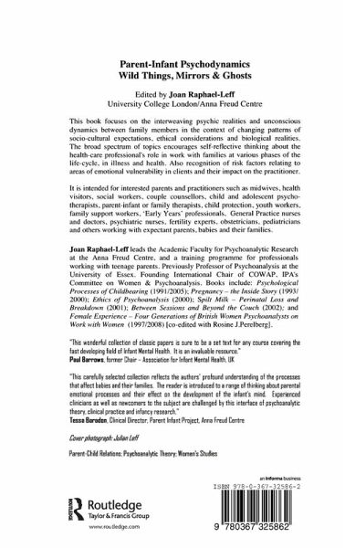 Preface Introduction: On wild things within an introduction to psychoanalytic thinking Face to Face Containment and Early Exchange Face and façade the mother's face as the baby's mirror Mirror role of mother and family in child development Conversations with a two month old Emotions and emotional communication in infants Where the wild things are The experience of the skin in early object relations A theory of thinking Unprocessed Residues1 Ghosts in the nursery: a psychoanalytic approach to the problems of impaired infant mother relationships Therapeutic interventions in infancy: two contrasting cases of persistent crying Sleep problems in babies and young children Into the night: children's dream books Unconscious communication The dead mother complex Representations and Reality Joy and woe: response to prenatal testing Parenting an infant with a birth defect the regulation of self esteem Amanda: observations and reflections of a bottle fed baby who found a breast mother Cannibalism and succour: is breast always best? (thoughts on 'Amanda') Management Issues Psycho analytic insight and relationships Understanding the language of babies The effect of infants' behaviour on maternal mental health Management of perinatal loss of a twin Pregnancy after stillbirth or neonatal death: psychological risks and management Feeding disorders