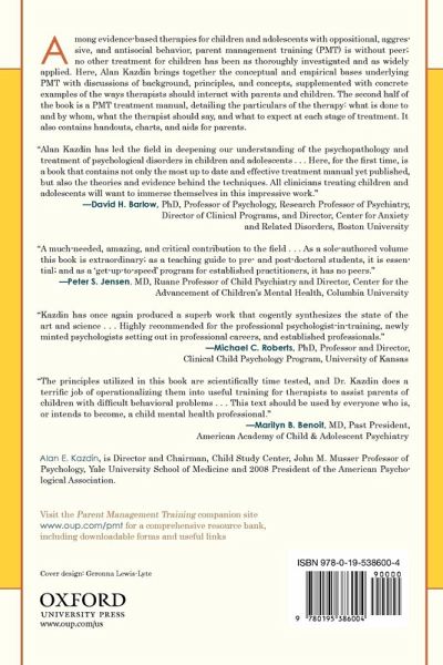 Among evidence-based therapies for children and adolescents with oppositional, aggressive, and antisocial behavior, parent management training (PMT) is without peer; no other treatment for children has been as thoroughly investigated and as widely applied. Here, Alan E. Kazdin brings together the conceptual and empirical bases underlying PMT with discussions of background, principles, and concepts, supplemented with concrete examples of the ways therapists should interact with parents and children. The second half of the book is a PMT treatment manual. The manual details the particulars of the therapy: what is done to and by whom, what the therapist should say, and what to expect at each stage of treatment. It also contains handouts, charts, and aides for parents. A companion web site (www.oup.com/pmt) provides additional resources for clinicians.