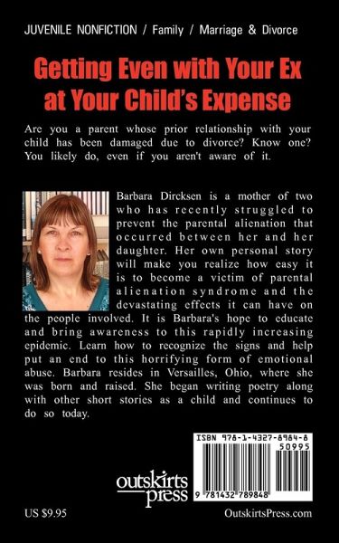 Parental Alienation is also referred to as Hostile Aggressive Parenting and it is a form of legal child abuse. It occurs when one parent undertakes a deliberate campaign to turn the child against the other and undermine the child's love for that other parent. Child custody battles are often complicated with hostile aggressive parenting, false accusations and situations where one parent alienates or brainwashes a child against the other parent with no evidence of wrongdoing. Child custody laws do not prevent hostile aggressive parenting and the most devastating cases often result in the alienation of affection toward one parent. The number of cases is steadily increasing at an alarming rate. Does parental alienation affect you or someone you know or love? Half of all marriages end in divorce, most involving children. Approximately one third of children are born out of wedlock. Many of the parents of these children, will sometimes, act out in an unreasonable or irrational manner when dealing with their children and the other parent. Whether it is intentional or not, this causes inexcusable torment to the child by creating a constant tug-of-war between them and their parents. In an increasing number of parents, their behavior towards the opposite parent becomes so offensive that, over time, the relationship between the children and the opposite parent is eventually destroyed along with the general well-being of the child. This is the story of how one devoted mother struggled to prevent the parental alienation that occurred between her and her beloved daughter. Her own personal account will make you realize how easy it is to become a victim of parental alienation syndrome and the devastating, long-term effects it can leave behind on the people involved. Included at the end of this book, are some fascinating facts about Parental Alienation (PA) and Parental Alienation Syndrome (PAS) to help you discover how it may be affecting you or a loved one. Learn how to recognize the signs right from the start. Get informed and become aware. Let's all help put an end to this form of emotional abuse, known as Parental Alienation.