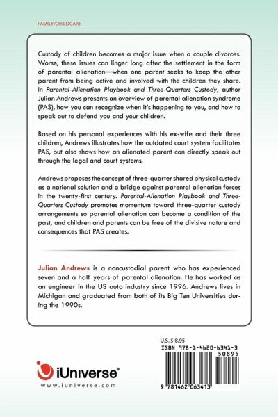 Custody of children becomes a major issue when a couple divorces. Worse, these issues can linger long after the settlement in the form of parent alienation-when one parent seeks to keep the other parent from being active and involved with the children they share. In Parental-Alienation Playbook and Three-Quarters Custody, author Julian Andrews presents an overview of parent-alienation syndrome (PAS), how you can recognize when it's happening to you, and how to speak out to defend you and your children. Based on his personal experiences with his ex-wife and their three children, Andrews illustrates how the outdated court system facilitates PAS, but also shows how an alienated parent can directly speak out through the legal and court systems. Andrews proposes the concept of three-quarter shared physical custody as a national solution and a bridge against parental alienation forces in the twenty-first century. Parental-Alienation Playbook and Three-Quarters Custody promotes momentum toward three-quarter custody arrangements so parental alienation can become a condition of the past, and children and parents can be free of the divisive nature and consequences that PAS creates.