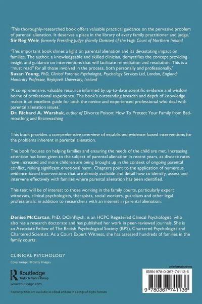 The book focuses on helping families and ensuring the needs of the child are met. Increasing attention has been given to the subject of parental alienation in recent years, as divorce rates have increased and more children are being brought up in the context of ongoing parental conflict, risking significant emotional harm. Chapters point to the application of numerous evidence-based interventions that are already available and detail how to identify, assess and intervene effectively with families where parental alienation has been identified.