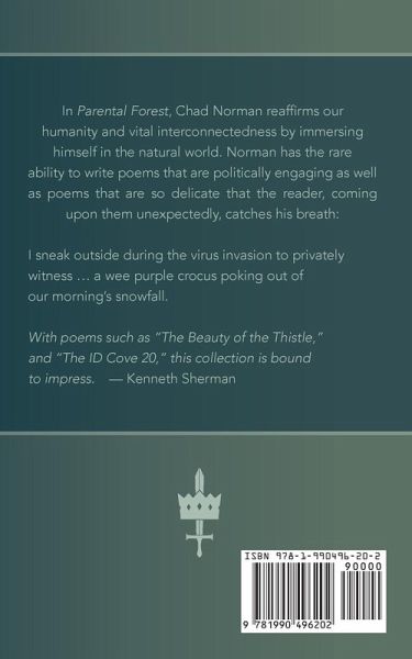 In Small Parental Forest, Chad Norman reaffirms our humanity and vital interconnectedness by immersing himself in the natural world. Norman has the rare ability to write poems that are politically engaging as well as poems that are so delicate that the reader, coming upon them unexpectedly, catches his breath: I sneak outside during the virus invasion to privately witness ... a wee purple crocus poking out of our morning's snowfall With poems such as "The Beauty of the Thistle," and "The ID Cove 20," this collection is bound to impress. - Kenneth Sherman
