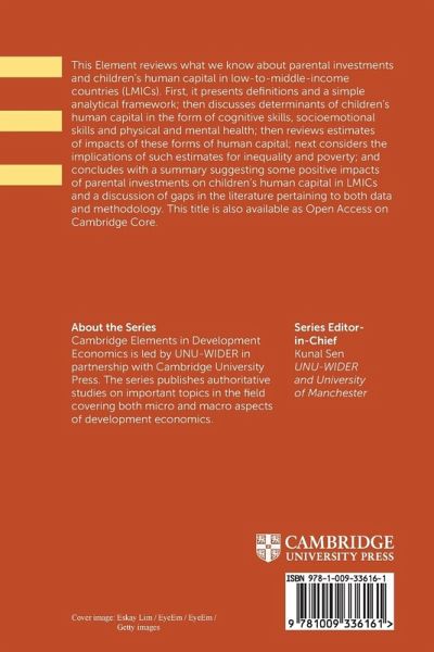 This Element reviews what we know about parental investments and children's human capital in low-to-middle-income countries and finds different patterns, often weaker relations, than associational studies. This title is also available as Open Access on Cambridge Core.