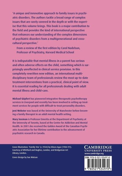 It is indisputable that mental illness in a parent has serious and often adverse effects on the child, a fact which is surprisingly unreflected in clinical service provision. An international, multidisciplinary team of professionals reviews the most up-to-date treatment interventions from a practical, clinical point of view in this completely rewritten new edition, It will be essential reading for all professionals dealing with adult mental illness and child-care. First Edition Hb (1996): 0-521-45259-7 First Edition Pb (1996): 0-521-45892-7