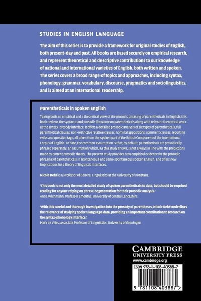 Taking both an empirical and a theoretical view of the prosodic phrasing of parentheticals in English, this book reviews the syntactic and prosodic literature on parentheticals along with relevant theoretical work at the syntax-prosody interface. It offers a detailed prosodic analysis of six types of parentheticals - full parenthetical clauses, non-restrictive relative clauses, nominal appositions, comment clauses, reporting verbs, and question tags, all taken from the spoken part of the British Component of the International Corpus of English. To date, the common assumption is that, by default, parentheticals are prosodically phrased separately, an assumption which, as this study shows, is not always in line with the predictions made by current prosodic theory. The present study provides new empirical evidence for the prosodic phrasing of parentheticals in spontaneous and semi-spontaneous spoken English, and offers new implications for a theory of linguistic interfaces.