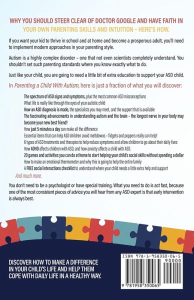 Why you should steer clear of Doctor Google and have faith in your own parenting skills and intuition - here's how. When a baby is born, you count the fingers and toes, you wait for the cry, and finally, there is a sense of relief that everything is ok. Over the next few months, you learn so much about this tiny human and, of course, plenty of reading about what to expect. But what happens when the expectations aren't met? When there is no sign of the first smile? Or there is no babbling back to you? Your first thought is that you are paranoid. Every baby is different and yours is just taking a little longer to develop. And then the suspicions start to add up. Fear, panic, stress are just some of what arises. As the issues become more apparent, your own health starts to suffer as you give everything to make sure your child is taken care of. Autism is a highly complex disorder - one that not even scientists completely understand. You shouldn't set such parenting standards where you know exactly what to do. Just like your child, you are going to need a little bit of extra education to support your ASD child. In Parenting a Child With Autism, here is just a fraction of what you will discover:The spectrum of ASD signs and symptoms, plus the most common ASD misconceptions What life is really like through the eyes of your autistic child How an ASD diagnosis is made, the specialists you may meet, and the support that is available The fascinating advancements in understanding autism and the brain - the longest nerve in your body may become your new best friend! How just 5 minutes a day can make all the difference Essential items that can help ASD children avoid meltdowns - fidgets and poppers really can help! 6 types of ASD treatments and therapies to help reduce symptoms and allow children to go about their daily lives How ADHD affects children with ASD, and how anxiety affects a child with ASD 20 games and activities you can do at home to start helping your child's social skills without spending a dollar How to make an emotional thermometer and why this is going to help the entire family A FREE social interactions checklist to understand where your child needs a little extra help and support And much more. You don't need to be a psychologist or have special training. What you need to do is act fast, because one of the most consistent pieces of advice you will hear from any ASD expert is that early intervention is always best. Every parent goes through life doubting their skills. When you are parenting an ASD child, these doubts can have a significant impact on their development. But all of that can change - starting today!If you want to make a difference in your child's life and help them cope with daily life in a healthy way, then scroll up and click the "Add to Cart" button right now.