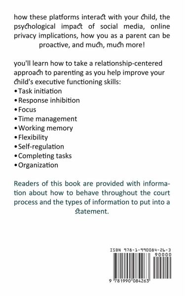 How these platforms interact with your child, the psychological impact of social media, online privacy implications, how you as a parent can be proactive, and much, much more! You'll learn how to take a relationship-centered approach to parenting as you help improve your child's executive functioning skills: Task initiation Response inhibition Focus Time management Working memory Flexibility Self-regulation Completing tasks Organization Readers of this book are provided with information about how to behave throughout the court process and the types of information to put into a statement.