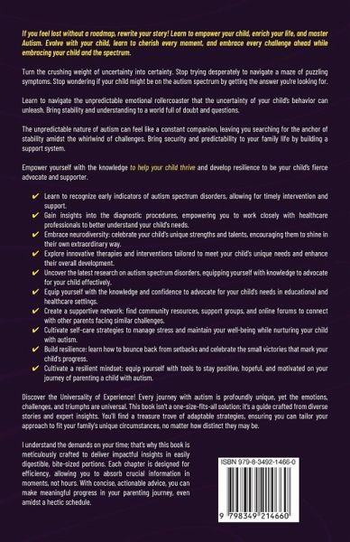 If you feel lost without a roadmap, rewrite your story! Learn to empower your child, enrich your life, and master Autism. Evolve with your child, learn to cherish every moment, and embrace every challenge ahead while embracing your child and the spectrum. Turn the crushing weight of uncertainty into certainty. Stop trying desperately to navigate a maze of puzzling symptoms. Stop wondering if your child might be on the autism spectrum by getting the answer you're looking for. Learn to navigate the unpredictable emotional rollercoaster that the uncertainty of your child's behavior can unleash. Bring stability and understanding to a world full of doubt and questions. The unpredictable nature of autism can feel like a constant companion, leaving you searching for an anchor of stability amidst the whirlwind of challenges. Bring security and predictability to your family life by building a support system. Empower yourself with the knowledge to help your child thrive and develop resilience to be your child's fierce advocate and supporter. Learn to recognize early indicators of autism spectrum disorders, allowing for timely intervention and support. Gain insights into the diagnostic procedures, empowering you to work closely with healthcare professionals to better understand your child's needs. Embrace neurodiversity: celebrate your child's unique strengths and talents, encouraging them to shine in their own extraordinary way. Explore innovative therapies and interventions tailored to meet your child's unique needs and enhance their overall development. Uncover the latest research on autism spectrum disorders, equipping yourself with knowledge to advocate for your child effectively. Equip yourself with the knowledge and confidence to advocate for your child's needs in educational and healthcare settings. Create a supportive network: find community resources, support groups, and online forums to connect with other parents facing similar challenges. Cultivate self-care strategies to manage stress and maintain your well-being while nurturing your child with autism. Build resilience: learn how to bounce back from setbacks and celebrate the small victories that mark your child's progress. Cultivate a resilient mindset: equip yourself with tools to stay positive, hopeful, and motivated on your journey of parenting a child with autism. Discover the Universality of Experience! Every journey with autism is profoundly unique, yet the emotions, challenges, and triumphs are universal. This book isn't a one-size-fits-all solution; it's a guide crafted from diverse stories and expert insights. You'll find a treasure trove of adaptable strategies, ensuring you can tailor your approach to fit your family's unique circumstances, no matter how distinct they may be.
