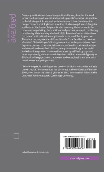 This tells of twenty-four couples negotiating the emotional and practical journey of parenting their learning 'disabled' child. The author, a researcher, sociologist and mother of a learning disabled daughter, questions the weak inclusive education discourse and unpacks parents' narratives in relation to denial, disappointment and social exclusion.