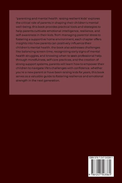 "parenting and mental health: raising resilient kids" explores the critical role of parents in shaping their children's mental well-being. this book provides practical tools and strategies to help parents cultivate emotional intelligence, resilience, and self-awareness in their kids. from managing parental stress to fostering a supportive home environment, each chapter offers insights into how parents can positively influence their children's mental health. the book also addresses challenges like balancing screen time, recognizing early signs of mental health struggles, and knowing when to seek professional help. through mindfulness, self-care practices, and the creation of strong support systems, parents will learn how to empower their children to navigate life's challenges with confidence. whether you're a new parent or have been raising kids for years, this book serves as a valuable guide to fostering resilience and emotional strength in the next generation.
