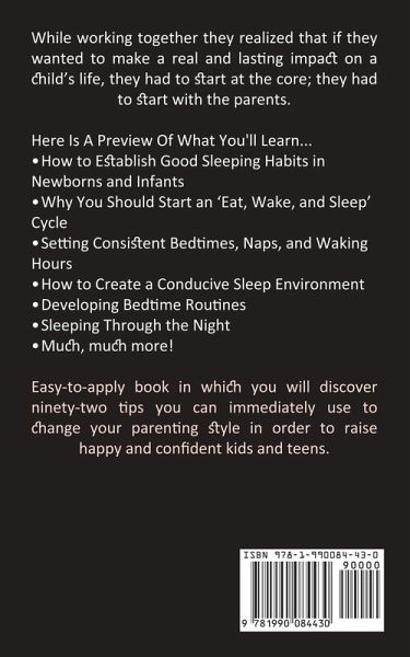 While working together they realized that if they wanted to make a real and lasting impact on a child's life, they had to start at the core; they had to start with the parents. Here Is A Preview Of What You'll Learn... ¿ How to Establish Good Sleeping Habits in Newborns and Infants ¿ Why You Should Start an 'Eat, Wake, and Sleep' Cycle ¿ Setting Consistent Bedtimes, Naps, and Waking Hours ¿ How to Create a Conducive Sleep Environment ¿ Developing Bedtime Routines ¿ Sleeping Through the Night ¿ Much, much more! Easy-to-apply book in which you will discover ninety-two tips you can immediately use to change your parenting style in order to raise happy and confident kids and teens.