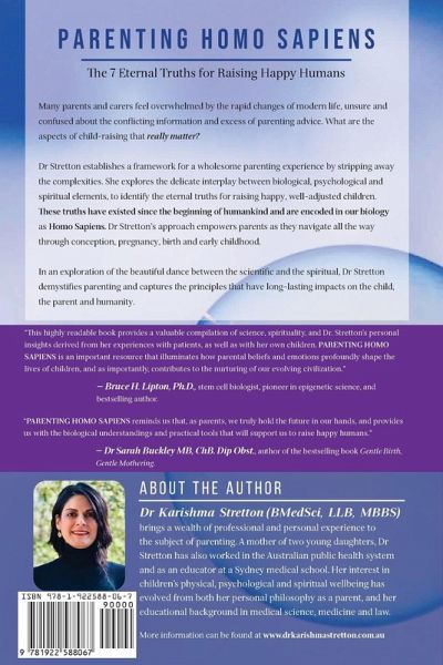 "This highly readable book provides a valuable compilation of science, spirituality, and Dr. Stretton's personal insights derived from her experiences with patients, as well as with her own children. PARENTING HOMO SAPIENS is an important resource that illuminates how parental beliefs and emotions profoundly shape the lives of children, and as importantly, contributes to the nurturing of our evolving civilization." Bruce H. Lipton, Ph.D., stem cell biologist, pioneer in epigenetic science, and author of the bestselling books, The Biology of Belief, Spontaneous Evolution (with Steve Bhaerman) and The Honeymoon Effect. "PARENTING HOMO SAPIENS reminds us that, as parents, we truly hold the future in our hands, and provides us with the biological understandings and practical tools that will support us to raise happy humans." Dr Sarah Buckley MB, ChB. Dip Obst., author of the bestselling book Gentle Birth, Gentle Mothering: A Doctor's Guide to Natural Childbirth and Gentle Early Parenting Choices Parenting Homo Sapiens is a must-read parenting book that cuts away the complexities to get to the heart of what really matters in child-rearing. Dr Karishma Stretton pairs her background in Medical Science, Medicine and Law with her experience as a mother, to explore the art of conscious parenting. Dr Stretton uses a strong scientific scaffold, combined with spiritual wisdom, to reveal the "7 Eternal Truths" of parenting that have guided our species for thousands of years. In adopting these truths it is possible to have a fulfilling and rewarding parenting experience, confidence in your approach, and happy, contented children. This clear, concise and well-written guidebook takes a unique approach to parenting, considering the whole development of the child as a continuum from conception through to childhood. The key to effective child-raising exists, and the elegance of this is that it has been tried and tested since the beginning of humankind. Parenting Homo Sapiens explores these concepts to inspire, empower and guide parents through today's rapidly changing society, resulting in happy children and parents. It is highly recommended for readers of Dr Gabor Maté or Dr Shefali Tsabary. More information can be found at www.drkarishmastretton.com.au