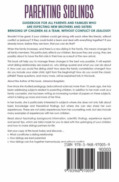 Parenting Siblings - Guidebook for all parents and families who are expecting new brothers and sisters - Bringing up children as a team, without conflict or jealousy Wouldn't it be great, if your children could get along with each other like friends, without conflict or jealousy? If they could build a team and deal with everything together? If you already know, before they are born, that you can do that? When the family increases, and there is a new sibling in the family, this means changes for all family members. This particularly affects our children. Because they are young, they are possibly about to have the first crisis in their lives as a result of the new arrival. This book will help you to manage these changes in the best way possible. It will explain what sibling relationships are based on, why siblings quarrel and what you can do about it. How can you avoid the sibling crisis? How does the family constellation change? How do you include your older child, right from the beginning? How do you avoid the classic pitfalls? These questions, and many more, will be explained fully in this book. About the Author of this book, Johanna Burgstein: Ever since she studied pedagogy (educational science) more than 10 years ago, she has been addressing subjects related to parenting children. In addition to her main work as a family counsellor, she has been writing an increasing number of papers on these subjects, which is taking up more and more of her time. In her books, she is particularly interested in subjects where she does not only talk about basic knowledge and theoretical findings, but where she can also share her own experiences. These are not solely experiences from her counselling work, but also include many examples of experiences with her own children. Read about fascinating background information, scientific findings, experience reports and secret tips, which are tailor-made for you to deal with the upbringing of your children and how to make siblings partners for life. Get your copy of this book today and discover ... ... What constitutes a sibling relationship ... How siblings are best parented ... How siblings can live together harmoniously and without conflict. Content of this book: Preface Siblings - what there is to know about them Sibling rivalry versus family harmony Sibling crisis involving the first-born The family is changing Breast feeding - Tandem breastfeeding "That is MINE!" - The problem with sharing Non-violent communication In conclusion - a summary of my tips Conclusion
