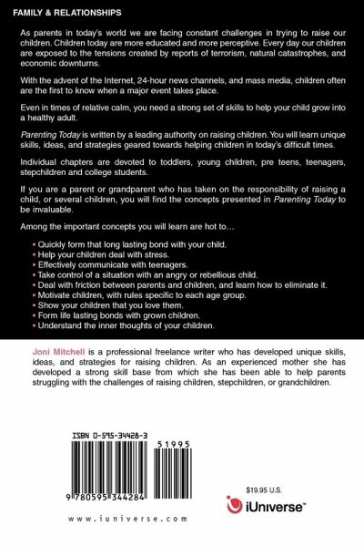 As parents in today's world we are facing constant challenges in trying to raise our children. Children today are more educated and more perceptive. Every day our children are exposed to the tensions created by reports of terrorism, natural catastrophes, and economic downturns. With the advent of the Internet, 24-hour news channels, and mass media, children often are the first to know when a major event takes place. Even in times of relative calm, you need a strong set of skills to help your child grow into a healthy adult. Parenting Today is written by a leading authority on raising children. You will learn unique skills, ideas, and strategies geared towards helping children in today's difficult times. Individual chapters are devoted to toddlers, young children, pre teens, teenagers, stepchildren and college students. If you are a parent or grandparent who has taken on the responsibility of raising a child, or several children, you will find the concepts presented in Parenting Today to be invaluable. Among the important concepts you will learn are hot to... Quickly form that long lasting bond with your child. Help your children deal with stress. Effectively communicate with teenagers. Take control of a situation with an angry or rebellious child. Deal with friction between parents and children, and learn how to eliminate it. Motivate children, with rules specific to each age group. Show your children that you love them. Form life lasting bonds with grown children. Understand the inner thoughts of your children.