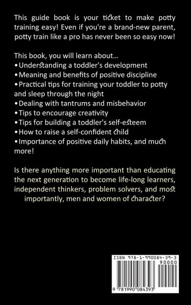 This guide book is your ticket to make potty training easy! Even if you're a brand-new parent, potty train like a pro has never been so easy now! This book, you will learn about... ¿ Understanding a toddler's development ¿ Meaning and benefits of positive discipline ¿ Practical tips for training your toddler to potty and sleep through the night ¿ Dealing with tantrums and misbehavior ¿ Tips to encourage creativity ¿ Tips for building a toddler's self-esteem ¿ How to raise a self-confident child ¿ Importance of positive daily habits, and much more! Is there anything more important than educating the next generation to become life-long learners, independent thinkers, problem solvers, and most importantly, men and women of character?