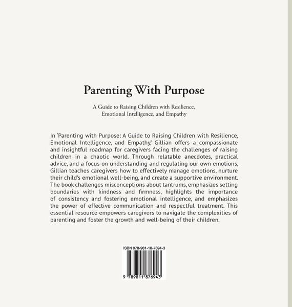 In 'Parenting with Purpose: A Guide to Raising Children with Resilience, Emotional Intelligence, and Empathy,' Gillian offers a compassionate and insightful roadmap for caregivers facing the challenges of raising children in a chaotic world. Through relatable anecdotes, practical advice, and a focus on understanding and regulating our own emotions, Gillian teaches caregivers how to effectively manage emotions, nurture their child's emotional well-being, and create a supportive environment. The book challenges misconceptions about tantrums, emphasizes setting boundaries with kindness and firmness, highlights the importance of consistency and fostering emotional intelligence, and emphasizes the power of effective communication and respectful treatment. This essential resource empowers caregivers to navigate the complexities of parenting and foster the growth and well-being of their children.