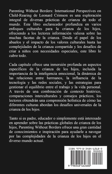 Parenting Without Borders: International Perspectives on Child-Rearing de Leonard Crimson es una exploración integral de diversas prácticas de crianza de todo el mundo. Este libro esclarecedor profundiza en varios enfoques culturales para la crianza de los hijos, ofreciendo a los lectores información valiosa sobre las muchas facetas de la crianza. Desde el papel de los abuelos y el impacto de los valores culturales hasta las complejidades de la crianza compartida y los desafíos de criar a niños con necesidades especiales, este libro lo cubre todo. Cada capítulo ofrece una inmersión profunda en aspectos específicos de la crianza de los hijos, incluida la importancia de la inteligencia emocional, la dinámica de las relaciones entre hermanos, la influencia de la tecnología y las redes sociales, y las estrategias para gestionar el equilibrio entre el trabajo y la vida personal. A través de una combinación de contexto histórico, comparaciones interculturales y consejos prácticos, los lectores obtendrán una comprensión holística de cómo las diferentes culturas abordan los desafíos universales de la crianza de los hijos. Tanto si es padre, educador o simplemente está interesado en aprender sobre las prácticas globales de crianza de los hijos, Parenting Without Borders ofrece una gran cantidad de conocimientos e inspiración para ayudarle a navegar por las complejidades de la crianza de los hijos en el diverso mundo actual.