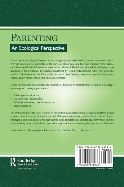 Parenting: An Ecological Perspective was originally created in 1993 to answer questions such as: Why do parents differ markedly in the ways in which they care for their children? What factors contribute to individual differences in parenting behavior? The framework used for addressing these questions is the ecological perspective developed by Urie Bronfenbrenner, who recognized that children's development is influenced by the interactions that they have over time with the people, objects, and symbols in their immediate environment. Luster and Okagaki have updated the original text focusing on parental behavior and also included 6 new chapters covering topics such as: *fathers/gender of parent; *children with special needs; *ethnicity and socioeconomic status; and *parent education. The text summarizes the latest research on factors that influence parenting, with each chapter providing a look at one important influence and the linkages among these various factors. An ecological perspective draws attention to the fact that the lives of parents and children are intertwined, and that understanding factors that influence parents is important for understanding the experiences of children.