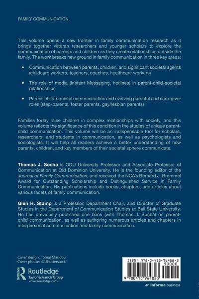 The volume opens a new frontier in parent-child communication research as it brings together veteran researchers and newcomers to explore the communication of parents and children as they create relationships outside the family. The chapters herein examine communication processes and problems of parents and children as they interact with childcare, healthcare, education, and youth sports; investigate the unique challenges facing various types of families as they communicate outside the family (e.g., stepfamilies and gay/lesbian/bisexual families); and consider the role of media in family relationships outside of home. The primary audiences for the volume includes scholars, researchers and graduate students studying communication in families, children's communication, communication in personal relationships, organizational communication, group communication, and health communication. It will also be of interest to psychologists who study families, children, and organizations; sociologists who study families, children, and organizations; education researchers; teachers; coaches; family physicians; and family therapists. graduate students It has the potential for use in courses in family communication, family studies, family sociology, and child development.