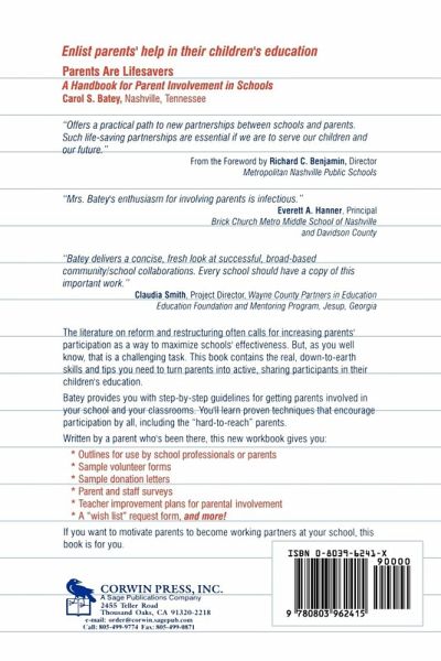 Much of the literature on school reform calls for creating opportunities for parent involvement in new and meaningful ways yet there has been little information on how to accomplish this. This useful Handbook contains a step-by-step model for parental participation in schools. Carol S Batey has gained national recognition in the United States for her implementation of such programmes. Her book includes sample parent volunteer forms, parent and staff surveys and lists of activities that will allow parents to be involved in the school according to what time and energy they have available.