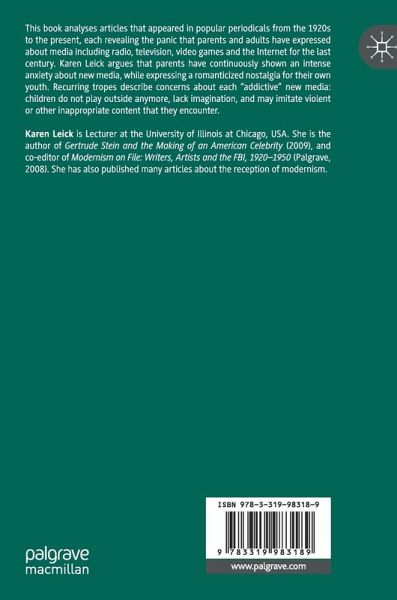 This book analyses articles that appeared in popular periodicals from the 1920s to the present, each revealing the panic that parents and adults have expressed about media including radio, television, video games and the Internet for the last century. Karen Leick argues that parents have continuously shown an intense anxiety about new media, while expressing a romanticized nostalgia for their own youth. Recurring tropes describe concerns about each "addictive" new media: children do not play outside anymore, lack imagination, and may imitate violent or other inappropriate content that they encounter.