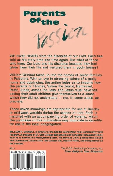 We have heard from the disciples of our Lord. Each has told us his story time and time again. But what of those who knew Our Lord and his disciples because they had given them their life and nurtured them in Godly homes? William Grimbol takes us into the homes of seven families in Palestine. With an eye to stressing values of a godly home and upbringing, the author helps us to imagine how the parents of Thomas, Simon the Zealot, Nathanael, Peter, Judas, James the Less, and Jesus must have felt, seeing their adult children give themselves to a cause which they did not understand -- nor, in some cases, appreciate. These seven monologs are appropriate for use at Sunday or mid-week worship during the season of Lent. Each is matched with an accompanying order of worship, which the purchaser of this publication may duplicate in quantity for use in the local congregation. William R. Grimbol is director of the Shelter Island (New York) Community Youth Program. A graduate of St. Olaf College (Minnesota) and Princeton Theological Seminary, he is married to a Presbyterian pastor. His previous CSS publications include The Communion Clown Circle, The Darkest Day, Passion Paths, and Perceptives on the Passion.