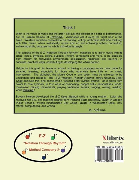 This book has simplified music ! ! The methods allow any age student, parent, teacher, and even senior citizens to experience the rewards and joy of music involvement. The base is a well thought out color code using the eight colors of a crayon box. I have been asked, "Why aren't they using this in the schools? Someone said, "It only needs to be known." But to break tradition is difficult. Let's break tradition!. The purpose of the E-Z "Notation Through Rhythm" Method Company's Resource Music Center Book, with its emphasis on Emergent Literacy and Composition, is to enhance the availability of music for everyone in a fun, easy, age appropriate, inexpensive way and most importantly to integrate music into classroom curriculum. Teachers, parents and students of varying abilities can investigate, explore, develop skills and knowledge in a class setting, or home, as an assignment, or as a self-discovery experience. And adult seniors can enjoy playing favorite melodies in an easy no stress manner, while keeping fingers agile. For years educators have voiced the need for music in school curriculum, as well as acknowledging that music contributes to the overall development of individuals. Thinking skills and language development may lead the list. Music literacy and the playing of an instrument are also viewed with great importance. Yet, as some authorities state, many students are missing out on learning to even sing our traditional songs, which means a deep loss. The activities introduced in the E -Z "Notation Through Rhythm" Resource Music Center Book blends music with reading and writing skills, especially with the four Composing Methods. Creativity is enhanced and encouraged when students, if desired, use the E-Z "Notation Through Rhythm" Standard Music Color Code (also known as the E-Z Keys Method and E-Z Keys International Standard Music Rainbow Color Code). This universal standardized Music Color Code makes it possible to integrate music into all areas of the curriculum in an easy, time efficient, and effective manner with the gradual transition to the traditional black and white music score as a goal. With this goal reached even more learning, composing and creative activities occur. Students already familiar with keyboards and music scores get involved with composing which further enhances their abilities and understanding. The methods in this book encourage at an early age, Emergent Literacy and Emergent Composing (vocabulary, reading and writing), through shared writing experiences. With adults writing the dictation of a youngster, or a youngster copying the writing of an adult, a lot of learning, including creative thinking, occurs. Elementary students that already read and write can compose tunes related to units they study like Mexico, cowboys, or various animals, as well as vocabulary, poems original or other, to enhance their skills.