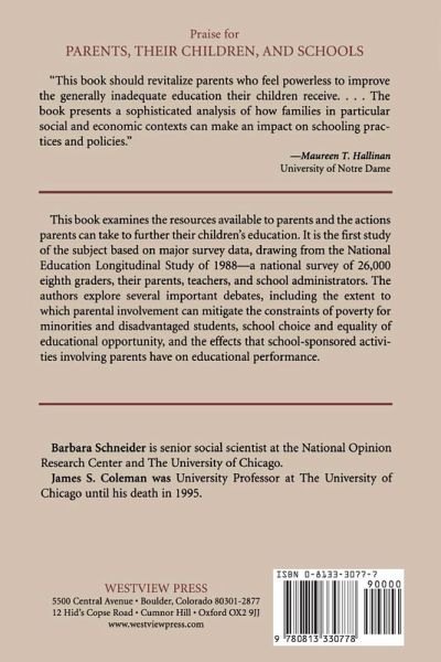 Parental involvement with children at home, in school, and in the community is one of the most important factors in educational success. Yet we know very little about the most effective approaches to parental intervention. Moreover, not all parents have the same resources or opportunities to act on the educational expectations they have for their children.This book examines the resources available to parents and the actions parents can take to further their children's education. It is the first study of the subject based on major survey data, drawing from the National Education Longitudinal Study of 1988?a national survey of 26,000 eighth graders, their parents, teachers, and school administrators. The authors explore several important debates, including the extent to which parental involvement can mitigate the constraints of poverty for minorities and disadvantaged students, school choice and equality of educational opportunity, and the effects that school-sponsored activities involving parents have on educational performance.Certain to change the thinking of educators and policymakers, this book is essential reading for scholars and parents as well.