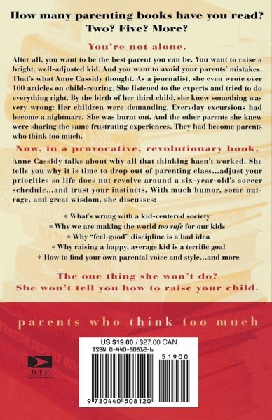 With the baby boom generation came the genre of parenting books that told parents how to teach their kids everything from toilet training to developing self-esteem. Generally the message has been: go easy on your child, but hard on yourself. It is starting to become apparent, especially in the best of families, that giving your kids lots of choices, validating their feelings at great peril to your own and providing "enough" individual attention for each child is creating a generation of kids over whom we have no control. Cassidy argues that this comes from over-thinking our role as parents. We've pondered every step so much that the juice, the joy, and worst of all, our confidence is gone. The reasons are clear: We have fewer children later in life so we've had more time to ponder. We've grown up just as research on infant and child development has come of age, so there's no shortage of material to think about. As a generation we've prided ourselves on self-improvement and we bring the same zeal to child improvement. We're less likely to live close to our families, and so are more likely to seek out expert solutions. To counter this thinking, Cassidy will suggest keeping the big picture in mind--what kind of people do you really want your kids to be? Honest, kind, cooperative, empathetic? It may mean losing sight of whether enough play dates are scheduled for the week and if you've positively reinforced the latest creative endeavor, but it will bring back your instincts about what is important to your family as a whole, and to your kids to become decent people.