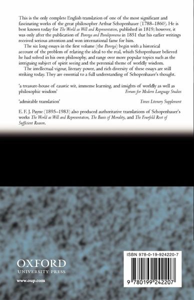 This is the only complete English translation of one of the most significant and fascinating works of the great philosopher Arthur Schopenhauer (1788-1860). The Parerga (Volume 1) are six long essays; the Paralipomena (Volume 2) are shorter writings arranged under thirty-one different subject-headings. These works won widespread attention with their publication in 1851, helping to secure lasting international fame for Schopenhauer. Indeed, their intellectual vigor, literary power, and rich diversity are still extraordinary even today.