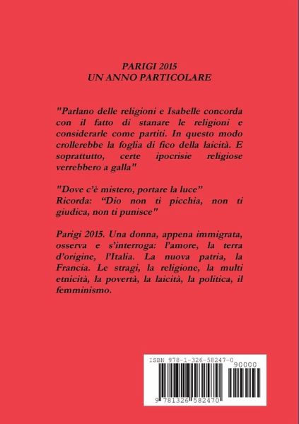 PARIGI 2015: UN ANNO PARTICOLARE, 2016 "Parlano delle religioni e Isabelle concorda con il fatto di stanare le religioni e considerarle come partiti. In questo modo crollerebbe la foglia di fico della laicità. E soprattutto, certe ipocrisie religiose verrebbero a galla" "Dove c'è mistero, portare la luce" Ricorda: "Dio non ti picchia, non ti giudica, non ti punisce" Parigi 2015. Una donna, appena immigrata, osserva e s'interroga. L'amore, la terra d'origine, l'Italia. La nuova patria, la Francia. Le stragi, la religione, la multi etnicità, la povertà, la laicità, la politica, il femminismo.