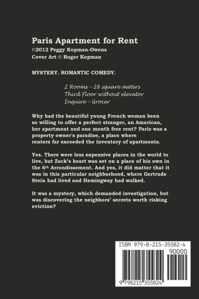 Cover Art © Roger Kopman. Why had the beautiful young French woman been so willing to offer a perfect stranger, an American,her apartment and one month free rent? Paris was a property owner's paradise, a place where renters far exceeded the inventory of apartments.Yes. There were less expensive places in the world to live, but Zack's heart was set on a place of his own in the 6th Arrondissement. And yes, it did matter that it was in this particular neighborhood, where Gertrude Stein had lived and Hemingway had walked. It was a mystery, which demanded investigation, but was discovering the neighbors' secrets worth risking eviction?