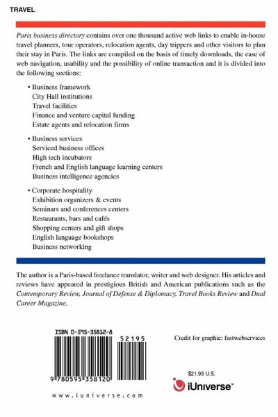 Paris business directory contains over one thousand active web links to enable in-house travel planners, tour operators, relocation agents, day trippers and other visitors, plan their stay in Paris. The links are compiled on the basis of timely downloads, the ease of web navigation, usability, the possibility of online transaction and divided into the following sections: Business framework City Hall institutions Travel facilities Finance and venture capital funding Estate agents and relocation firms Business services Serviced business offices High tech incubators French and English language learning centers Business intelligence agencies Corporate hospitality Exhibition organizers & events Seminars and conferences centers Restaurants, bars and cafés Shopping centers and gift shops English language bookshops Business networking