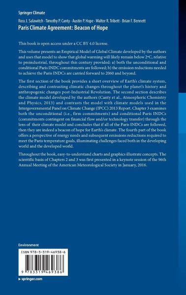 The first section of the book provides a short overview of Earth's climate system, describing and contrasting climatic changes throughout the planet's history and anthropogenic changes post-Industrial Revolution. The second section describes the climate model developed by the authors (Canty et al., Atmospheric Chemistry and Physics, 2013) and contrasts the model with climate models used in the Intergovernmental Panel on Climate Change (IPCC) 2013 Report. Chapter 3 examines both the unconditional (i.e., firm commitments) andconditional Paris INDCs (commitments contingent on financial flow and/or technology transfer) through the lens of their climate model and concludes that if all of the Paris INDCs are followed, then they are indeed a beacon of hope for Earth's climate. The fourth part of the book offers a perspective of energy needs and subsequent emissions reductions required to meet the Paris temperature goals, illuminating challenges faced both in the developing world and the developed world.