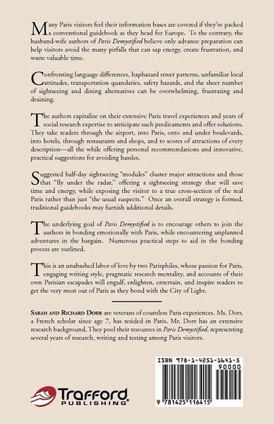 Sarah and Richard Dorr, veteran Paris travelers and researchers, understand the logistical and sightseeing challenges that can compromise the enjoyment of a Paris visit. Paris Demystified contains a unique cornucopia of pointers on how to avoid the pitfalls of Paris and become immersed in the "real" Paris, while minimizing frustration and fatigue. An engaging writing style and tourist perspectives escort the reader through the airport, into Paris, onto and under boulevards, into hotels, through restaurants and shops, and to scores of attractions-all the while offering innovative, practical advice on how to avoid Parisian pitfalls. Geographic "sightseeing modules" combine sightseeing efficiency with cross-sections of major attractions and those "flying under the radar." Samples of other contents: vocabulary aids (with phonetic pronunciations), headed by 40 "survival terms;" a simplified method for mastering the Métro; a script for making reservations en Français; the reassuring lowdown on Parisians' reputations for aloofness; clues for spotting and thwarting pickpockets; a complete list of Paris taxi stations; and the authors' personal recommendations of restaurants, hotels, and lesser-known sightseeing gems; and many more. This is not a typical guidebook. After Paris Demystified is used to plan an overall strategy for "attacking" Paris, conventional guidebooks may then be consulted for additional details.