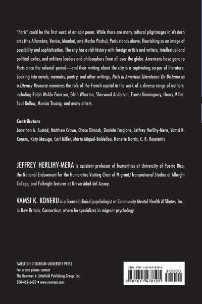 Acknowledgments Introduction On Distance as a Literary Resource, Jeffrey Herlihy and Vamsi K. Koneru Chapter 1 Emerson in Paris, C.R. Resetarits Chapter 2 Je l'ai dans mon sang!-Paris in Edith Wharton's Madame de Treymes, Marta Miquel-Baldellou Chapter 3Forget Paris: Sherwood Anderson and the American Expatriate Grotesque, Carl Miller Chapter 4 From Dada to Nada: The Dadaist Influence on Hemingway's Works Between 1922-1926, Jonathan Austad Chapter 5 The Nightinghouls of Paris: Robert McAlmon's Queer Paternalism and The Twilight of the Expatriate Movement, Chase Dimock Chapter 6 Miller's Henry and Henry's Paris, Katy Masuga Chapter 7Chicago Adventures in Paris: Foreignness and Saul Bellow's Creative Opposition, Matthew Crowe Chapter 8 The Road to Paris in Tim O'Brien's Going After Cacciato, Nanette Norris Chapter 9"What Keeps you here?": Paris, Language, and Exile in The Book of Salt by Monique Truong, Daniela Fargione Epilogue: The Futures of American Paris, Jeffrey Herlihy-Mera and Vamsi K. Koneru Index Notes on Contributors