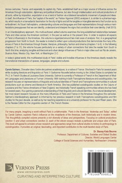 Across centuries, France -and especially its capital city, Paris- established itself as a major source of influence across the Americas through colonization, diplomacy and political influence, but also through intellectualism and cultural productions of all sorts, either by imposition, exportation or as a trend of fashion via a bilateral transatlantic movement of people and ideas. In itself, the influence of Paris, the "capital of the world," as Patrice Higonnet (2002) analyzes it, is similar to a phantasmagoria, which results in a transatlantic fascination for the city of lights and all the tangible or intangible elements that function as its embodiment. As Stuart Hall explains, understanding cultures and languages and their representations through various manifestations presupposes that we can identify, understand and interpret the signs that constitute their core identity. (Hall 2013). In an interdisciplinary approach, this multi-authored, edited volume examines the long-established relationships between Paris and cities across the American continent, in the past as well as in the present time. In order to explore all aspects of Paris's influence(s) in the Americas, this volume is organized around two main axes of analysis: first, in a geographical progression from North to South, the reader is invited to reflect upon cultural productions that demonstrate the many influences of Paris in the Americas through theater, literature, philosophy, fashion and cinema (chapters 1 to 6). In the following chapters (7 to 11), the volume focuses particularly on a variety of urban connections that take the reader from South to North this time, analyzing tangible architectural and urban design influences of Paris in major cities such as Rio de Janeiro, Buenos Aires, Mexico City, New York, or Washington D.C. In today's global world, this multifaceted study of Paris' visible and invisible influences in the Americas clearly reveals the transnational intersections of spaces, languages, people and cultures.
