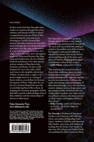 In Paris in the Dark Eric Smoodin takes readers on a journey through the streets, cinemas, and theaters of Paris to sketch a comprehensive picture of French film culture during the 1930s and 1940s. Drawing on a wealth of journalistic sources, Smoodin recounts the ways films moved through the city, the favored stars, and what it was like to go to the movies in a city with hundreds of cinemas. In a single week in the early 1930s, moviegoers might see Hollywood features like King Kong and Frankenstein, the new Marlene Dietrich and Maurice Chevalier movies, and any number of films from Italy, Germany, and Russia. Or they could frequent the city's ciné-clubs, which were hosts to the cinéphile subcultures of Paris. At other times, a night at the movies might result in an evening of fascist violence, even before the German Occupation of Paris, while after the war the city's cinemas formed the space for reconsolidating French film culture. In mapping the cinematic geography of Paris, Smoodin expands understandings of local film exhibition and the relationships of movies to urban space.