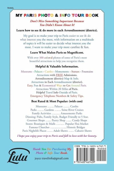 With over 100 colored photos of some of Paris's most beautiful attractions to help you recognize them. Helpful & Valuable Information. Museums - Palaces - Castles - Monuments - Statues - Fountains Attractions with FREE Admissions. Arrondissement (district) Map & Info. Attractions in Each Arrondissement (district). Easy, Fun & Economical Ways to Get Around Paris. Attractions Within 20 Miles of Paris. Helpful Travel Info Outside of Paris. Emergency Telephone Numbers & Safety Tips. Best Rated & Most Popular: (with cost) Museums ....... Palaces ....... Castles Parks ....... Gardens ....... Seine River Cruises My goal is to make your trip to Paris easier to see & do what interest you the most, with information on a multitude of topics it will be easier to decide what interest you the most. I want to make your trip more carefree & fun.