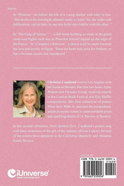 In "Princess," we follow the life of a young teacher with baby in tow; "She strolls in the moonlight, ethereal, misty, a vision. No, she walks with deliberation, carries baby in one arm holds onto toddler with the other.." In "The Cusp of Venice," "(A) full moon building as water in the grand canal rose higher each day as Poseidon himself lapped up the steps of the Piazza." In "Cleopatra's Remorse," a choice must be made between her love and loyalty to Egypt. "Does her heart truly ache for Anthony or has it become caustic and soundproof." There is dramatic dialogue between Persephone and Zeus in "The Plea," " Father Zeus, do not cast me down to the dank land of stealth, to moldy things.."; and in the title poem "Paris Spoken Here", "When the rain came down hard, you hustled us off to a warm brasserie to purchase a café crème.."